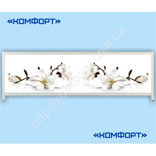 Экран «Магнолия» из серии АРТ станет эффектным украшением вашей ванной комнаты. Белые нежные магнолии умиротворяют, создают хорошее настроение. Это изображение впишется в любой интерьер, как смотрится такой экран на ванну раздвижной, фото наглядно демонстрирует. Выполнена конструкция из алюминиевого каркаса и пвх, качество отменное. В нашем-интернет магазине цена экрана на ванну раздвижного невысокая, размер данной модели – 170*50.